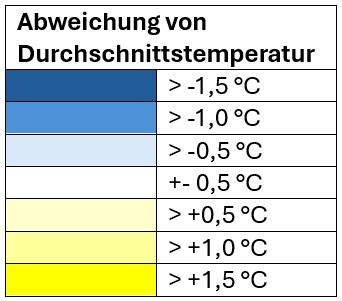 Mouseover über „Rote Ecken”: Es wird z. B. Rang K 3 W 8 angezeigt = das drittkälteste und das achtwärmste Jahr im Zeitraum 1883 bis 2025.