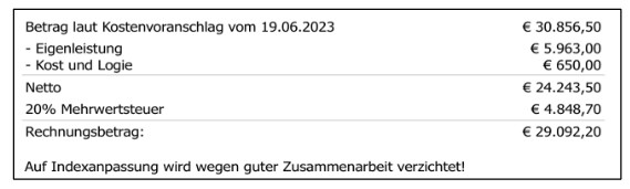 Wir ersuchen Sie, den Betrag von € 3.891,75 auf das Konto der Pfarre Gastern IBAN AT19 3290 4001 0030 4667 zu überweisen. Wir weisen darauf hin, dass dies eine vorläufige Abrechnung unter Berücksichtigung der voraussichtlichen Zuschüsse ist. Änderung sind noch möglich.